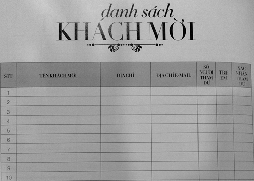 Lên danh sách khách mời (sơ lược) để dự trù số bàn đặt nhà hàng, bao gồm khách của song thân và của CD-CR.
