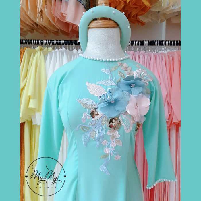 Áo dài bê quả xanh ngọc đính hoa - cho thuê áo dài bưng quả Gò Vấp