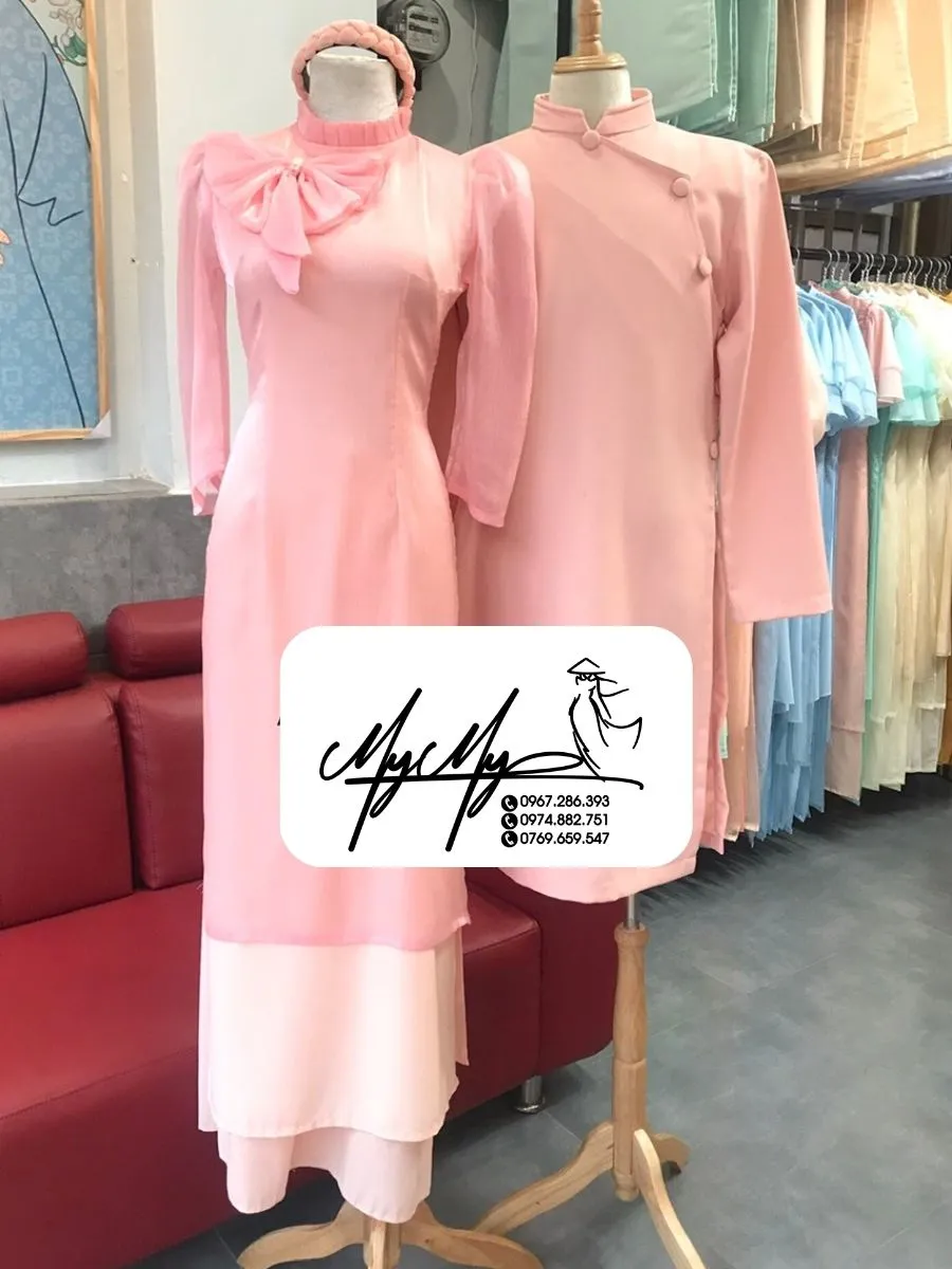 Áo dài nữ: Kiểu dáng thanh lịch với phần cổ cao nhún bèo nhẹ nhàng, tạo điểm nhấn sang trọng. Thiết kế tay dài voan mỏng giúp tôn lên vẻ thướt tha, quý phái. Phần vai áo có nơ mềm mại, tạo điểm nhấn nữ tính và duyên dáng. Tà áo dài hai lớp kết hợp quần lụa trắng mang đến nét thanh thoát, yêu kiều. Kèm theo mấn đội đầu cùng tông màu, tăng thêm vẻ trang nhã.