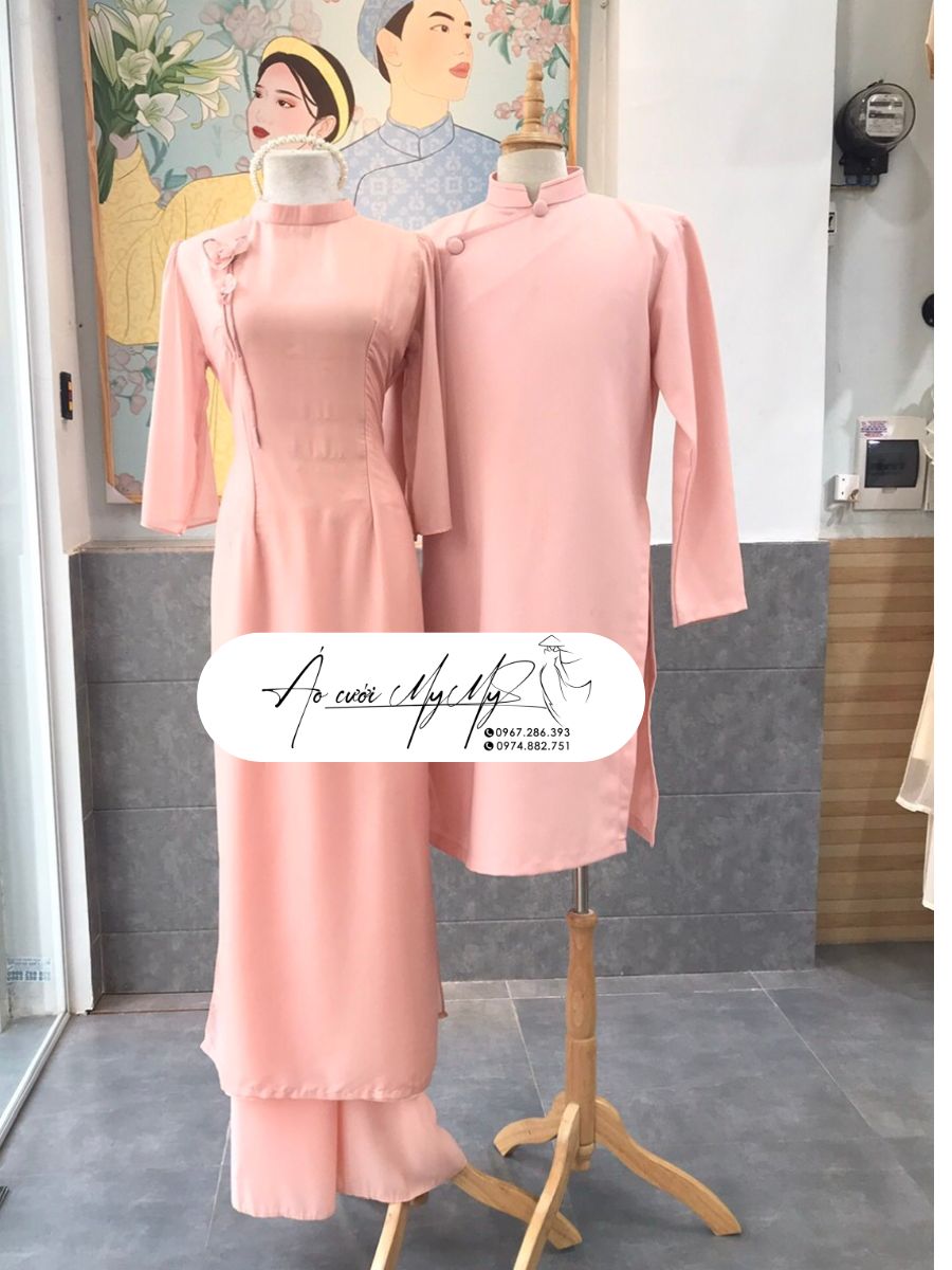 Áo dài nam: Phối đồng màu hồng pastel nhẹ nhàng, cổ trụ lịch sự, kiểu dáng cổ điển cách tân với hàng nút tinh tế – tạo nên sự hài hòa khi đứng cùng áo nữ.