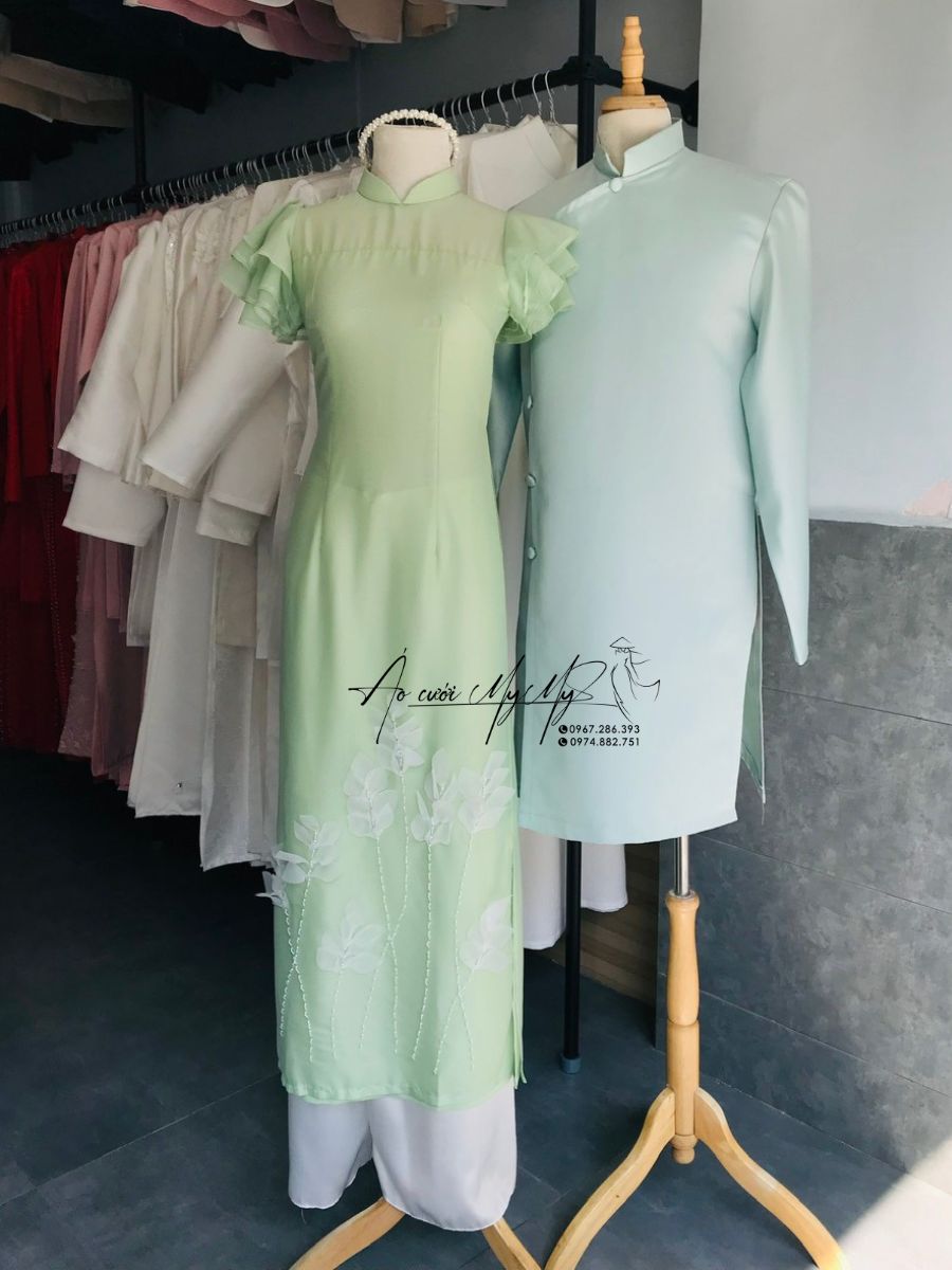 - Màu sắc: Đồng bộ tông xanh pastel, tạo sự hài hòa khi kết hợp cùng áo dài nữ.