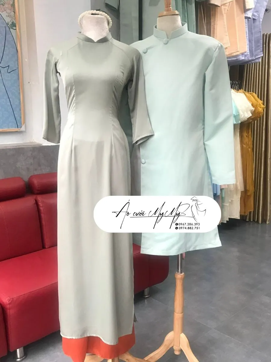 Áo dài nam: Kiểu dáng truyền thống với cổ cao, hàng khuy bấm đặc biệt, tạo sự chỉn chu và sang trọng.