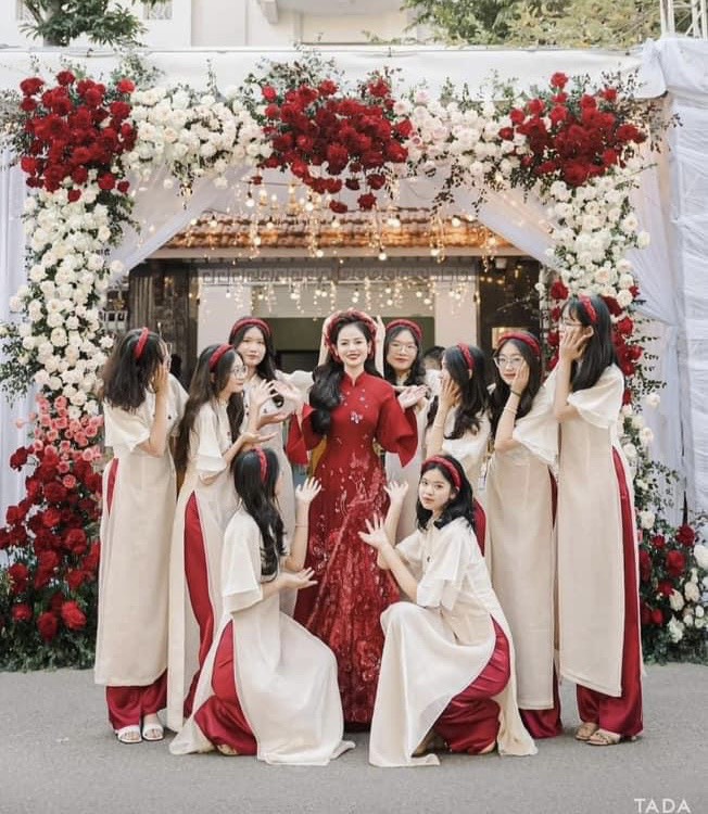 Áo dài bưng quả màu kem phối quần đỏ sẽ dễ phối với áo dài cưới đỏ của cô dâu - chú rể