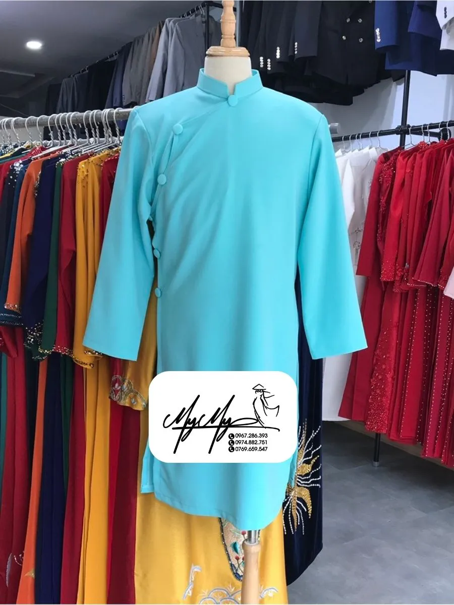 Thiết kế : Áo dài nam cách tân, phong cách hiện đại với cổ đứng, hàng khuy chéo, giúp tôn lên vẻ sang trọng.