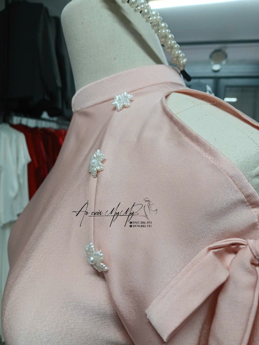 Cho thuê áo dài bưng quả nữ màu hồng phấn, thiết kế hiện đại kết hợp nét truyền thống, giúp đội hình phù dâu nổi bật và duyên dáng trong ngày cưới hỏi.