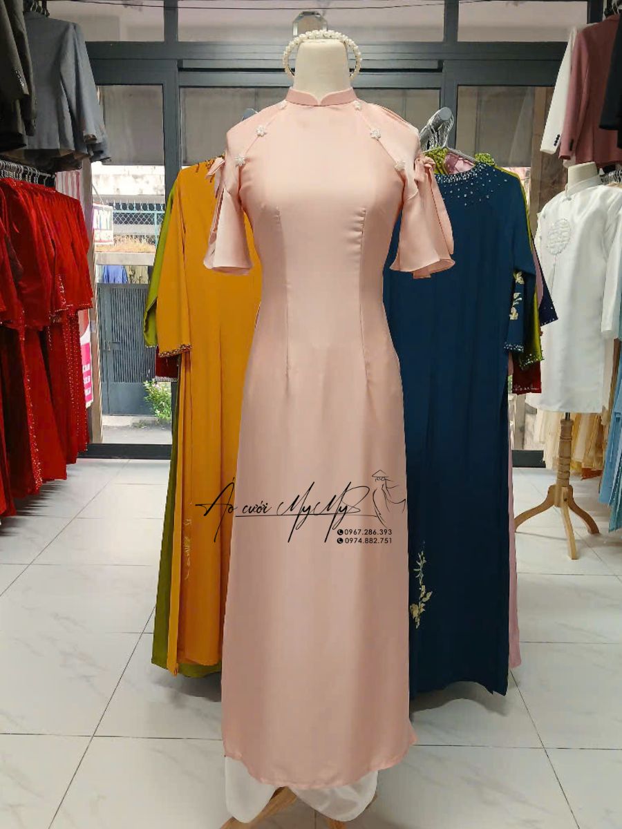 Mẫu áo dài nổi bật với gam màu hồng phấn ngọt ngào, phù hợp với mọi tone da, mang đến vẻ ngoài nhẹ nhàng, thanh thoát.