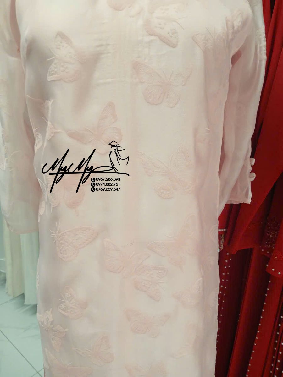 Điểm nổi bật của mẫu áo là họa tiết bướm nổi được trải đều khắp thân áo và áo tay, tạo hiệu ứng thị giác nhẹ nhàng, nữ tính và vô cùng duyên dáng. Màu hồng nhạt biểu tượng cho sự dịu dàng, tình yêu ngọt ngào và sự khởi đầu tốt đẹp – rất thích hợp trong không khí lễ cưới.