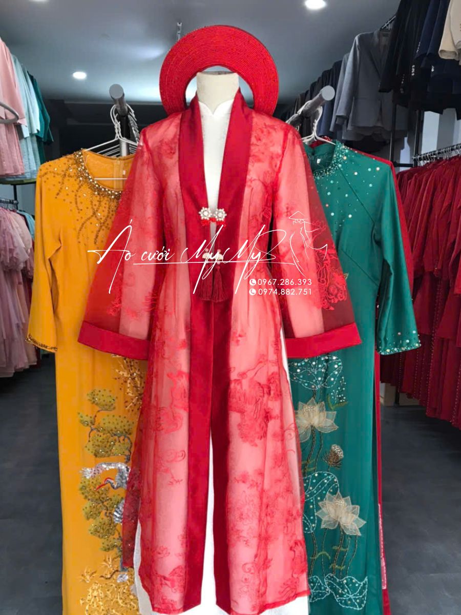 - Thiết kế: Kiểu áo choàng dài thướt tha với màu đỏ nổi bật, giúp tôn lên vẻ đẹp quý phái. Áo có đường xẻ tà tinh tế, dễ dàng kết hợp cùng áo dài truyền thống.